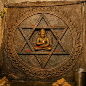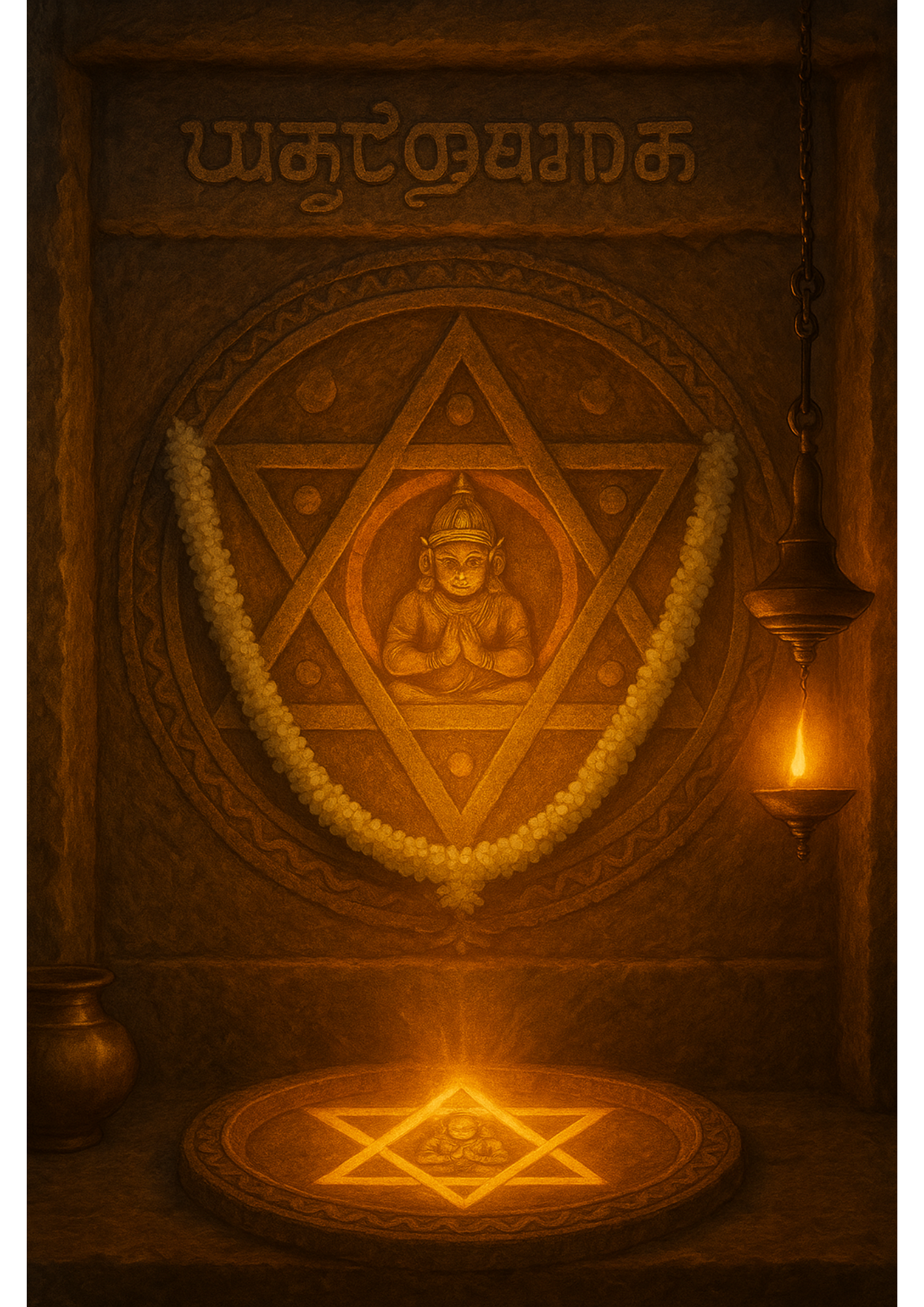 At Sri Yantrodharaka Hanuman Temple, Lord Hanuman is uniquely depicted in deep meditation, seated within a sacred yantra. This rare form symbolizes his inner strength, devotion, and control over mind and senses, radiating divine tranquility.